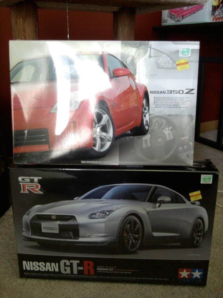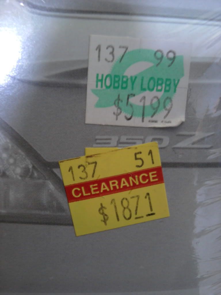 Well I was at Hobby Lobby today with my girlfriend and decided I'd go look at the models while she looked for something to hang on the wall, I walked over there not finding much at all since they remodeled. I was looking at a GTO and seen this GTR and 350Z behind another kit, I couldn't pass them up since I work a Nissan dealership and have driven both of the 1:1 cars, then I noticed the clearance price and took them striaght to the shopping cart.